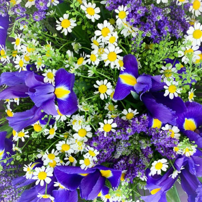 Вероника – 6 шт.Зелень – 3 шт.Матрикария – 6 шт.ирисы – 15 шт.