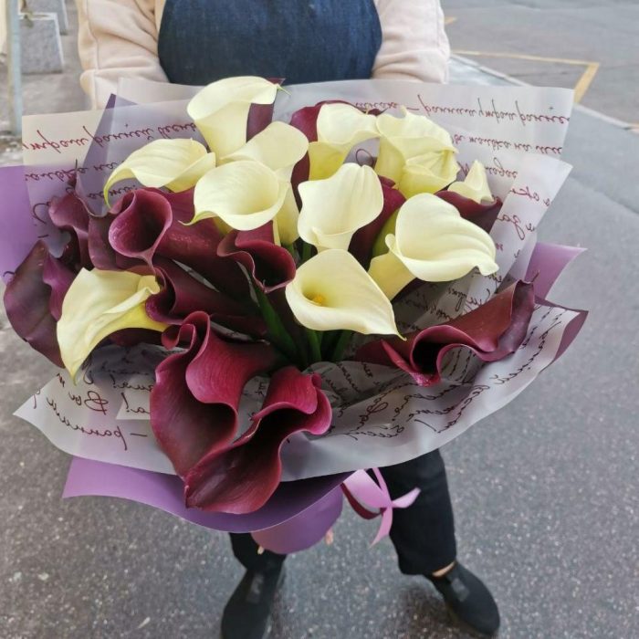 Букет из 25 белых и бордовых калл