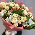 Альстромерия – 6 шт.Роза кустовая – 5 шт.Зелень – 3 шт.Лента атласная – 2 шт.Упаковка дизайнерская – 3 шт.