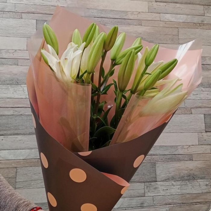 Лента атласная – 2 шт.Упаковка дизайнерская – 2 шт.Лилия Азиатская белая – 5 шт.
