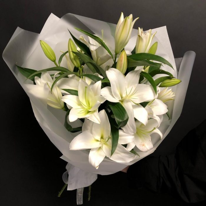 Лента атласная – 2 шт.Пленка матовая – 3 шт.Белый крафт – 2 шт.лилия белая премиум – 3 шт.