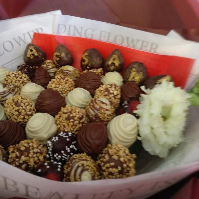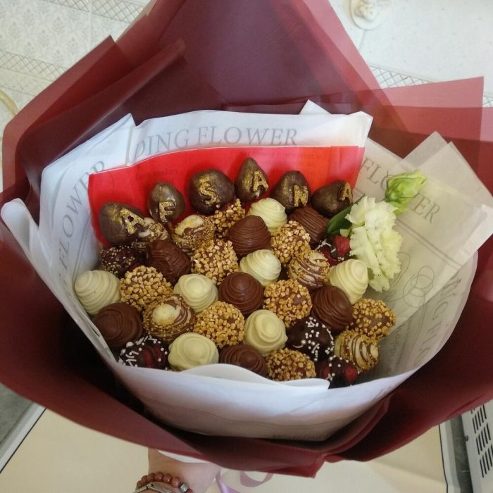 Клубника в шоколаде callebaut (бельгия) – 46 шт.Дизайнерская упаковка – 1 шт.Лизиантус – 1 шт.транспортировочная пленка – 1 шт.