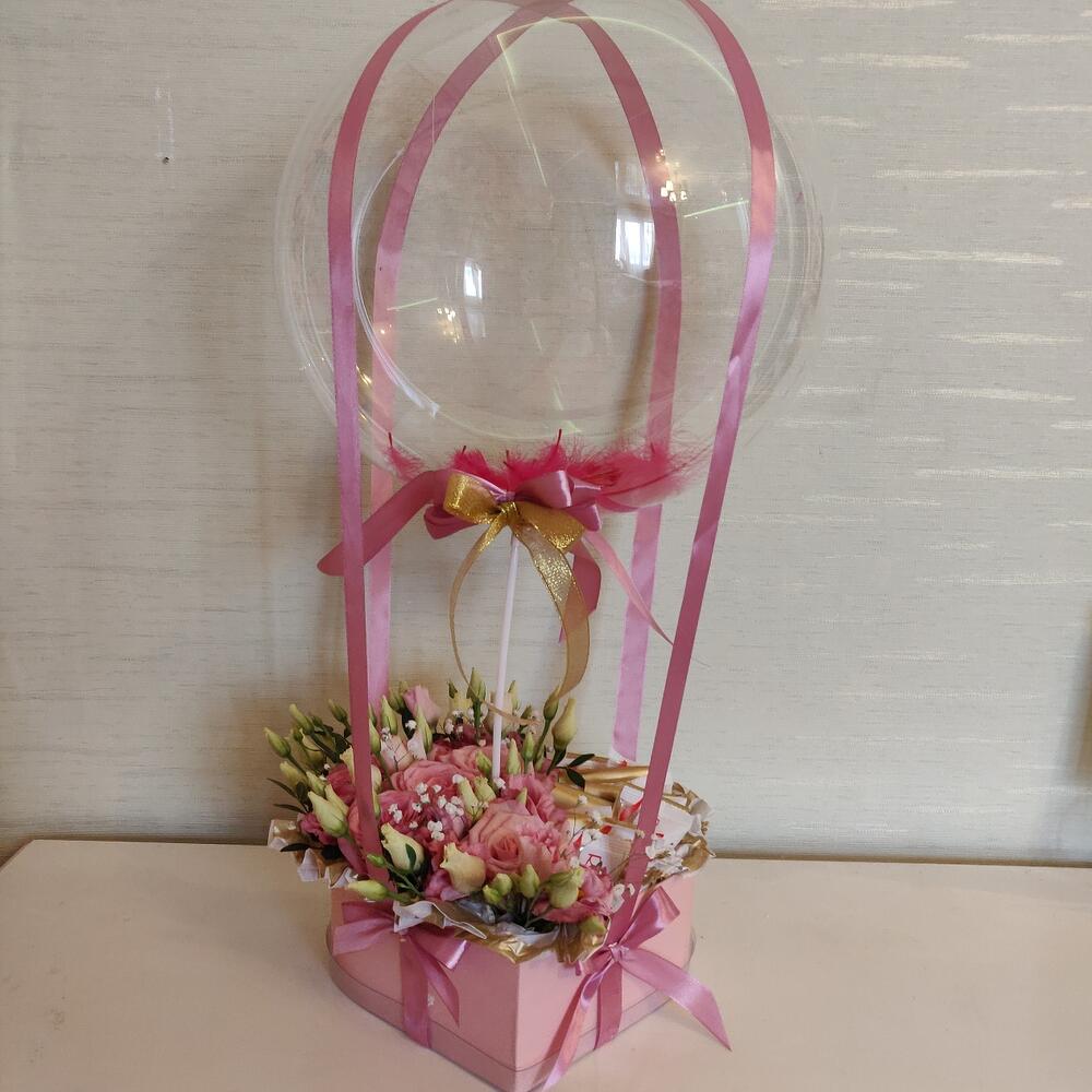 Коробка сердце – 1 шт.розы эквадор (60 см) – 7 шт.Лизиантус – 5 шт.Конфеты Raffaello – 250 гр.шар бабл с перьями – 1 шт.