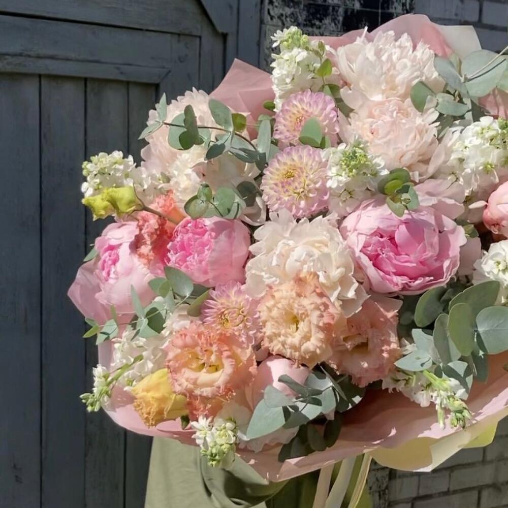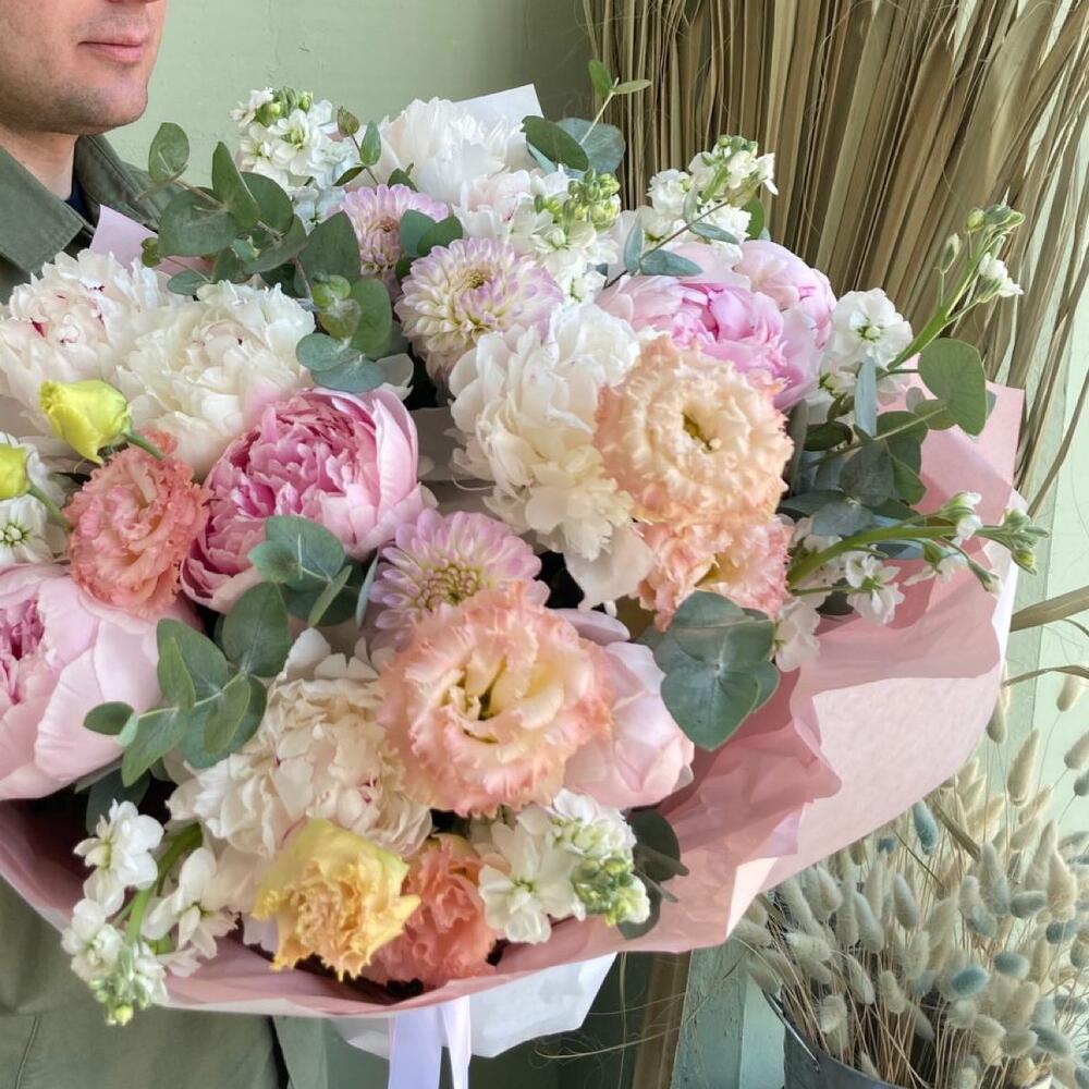 Пион – 9 шт.Маттиола – 11 шт.Лизиантус – 5 шт.Георгина – 3 шт.Эвкалипт – 11 шт.Упаковка – 1 шт.