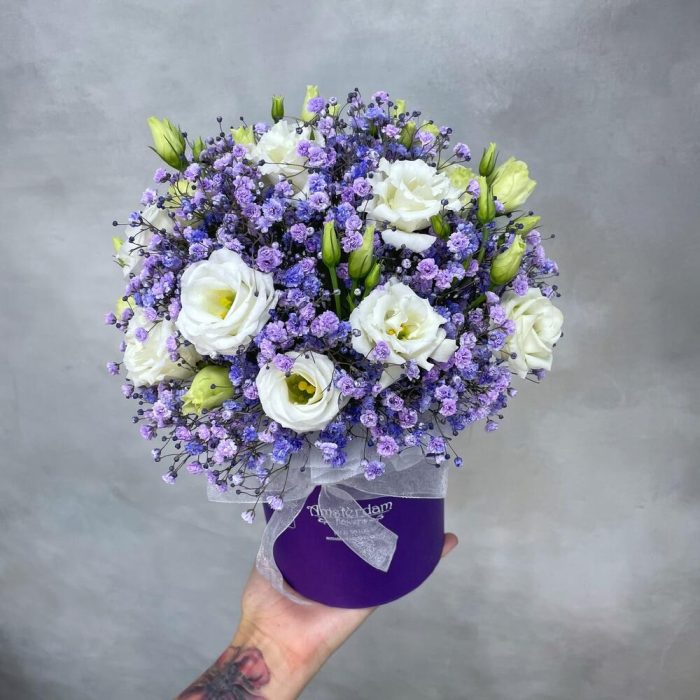 Коробочка с лизиантусами и гипсофилой