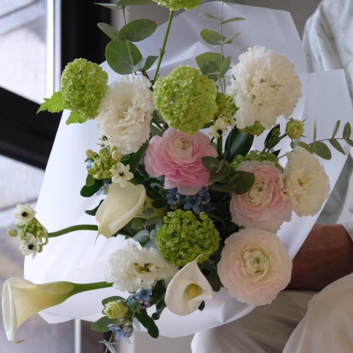 Цветы в коробке с пион розами,сиренью,ранункулюсами,эустомой,тюльпанами,матиолой,пионовидными кустовыми розами