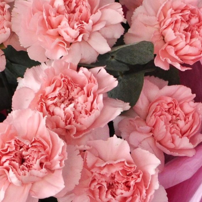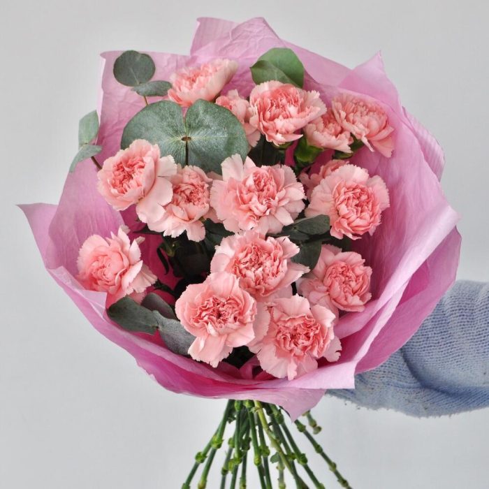 Гвоздика сортовая розовая – 15 шт.Эвкалипт – 3 шт.Упаковка дизайнерская – 1 шт.