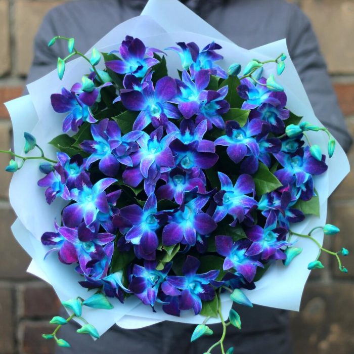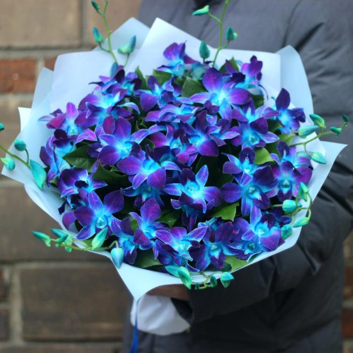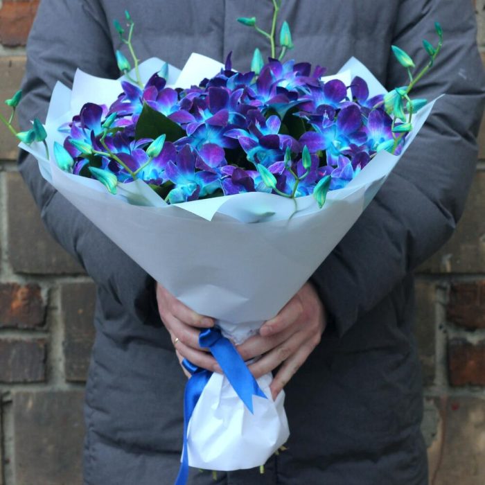 Рускус – 10 шт.Лента атласная – 1 шт.удлинитель для орхидеи – 25 шт.Средство для продления жизни цветов – 1 шт.упаковка тиффани – 3 шт.инструкция по уходу за цветами – 1 шт.любовь флориста (бесплатно) – 1 шт.орхидея дендробиум синяя цветочки – 51 шт.