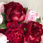 Лента – 2 шт.Зелень – 5 шт.Шляпная коробка – 1 шт.Оазис флористический – 1 шт.пион розовый сара бернар – 10 шт.пион бордовый ред шарм – 5 шт.