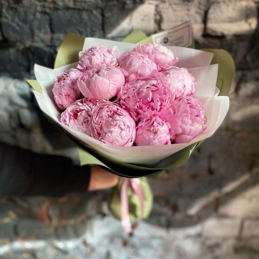 Букет из 11 пионов в дизайнерской упаковке “Джун Спринг”
