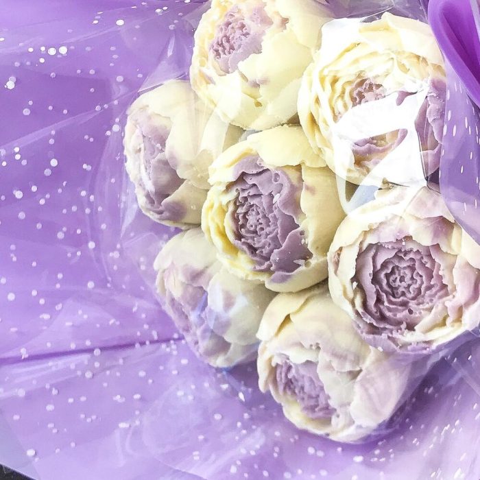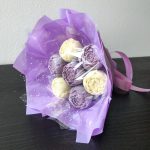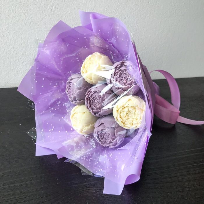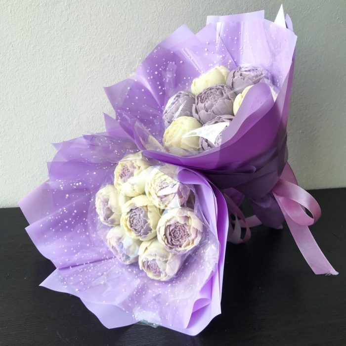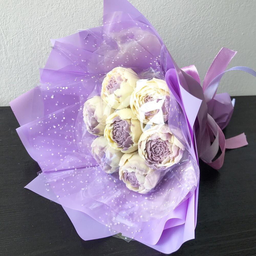 Букет из 7 Шоколадных пионов в авторской сиреневой упаковке