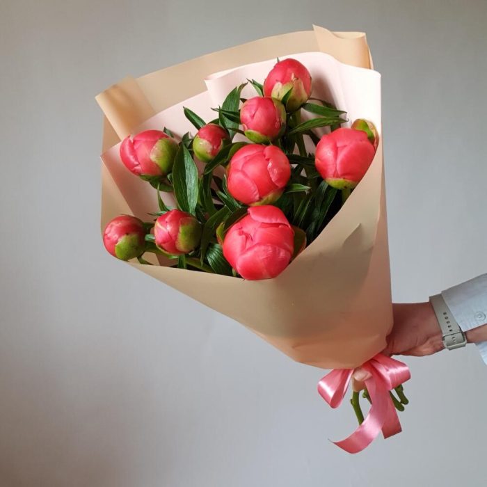 Упаковка – 1 шт.Лента атласная – 1 шт.Пион коралловый – 9 шт.