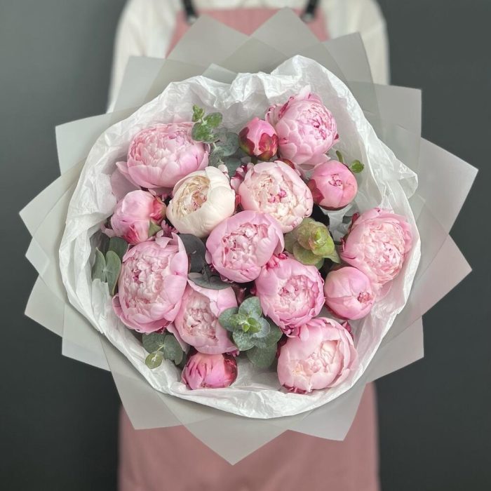 Пион – 15 шт.Эвкалипт – 7 шт.Лента атласная – 1 шт.Бумага тишью – 3 шт.бумага дизайнерская – 6 шт.