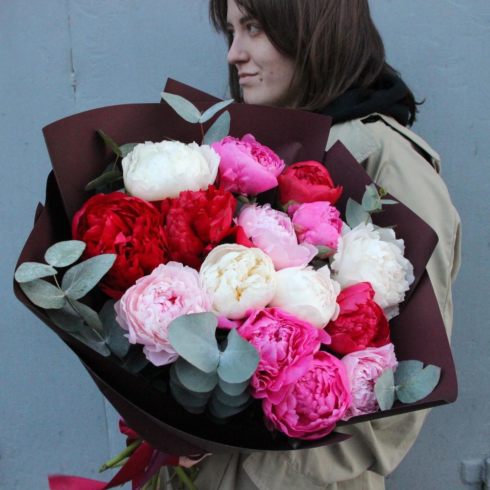 Пион – 15 шт.Эвкалипт – 7 шт.Упаковка – 3 шт.Лента атласная – 2 шт.