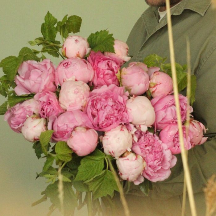 Охапка нежных пионов с веточками малины.