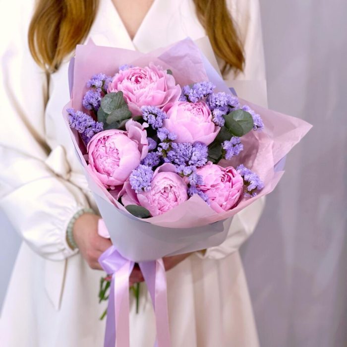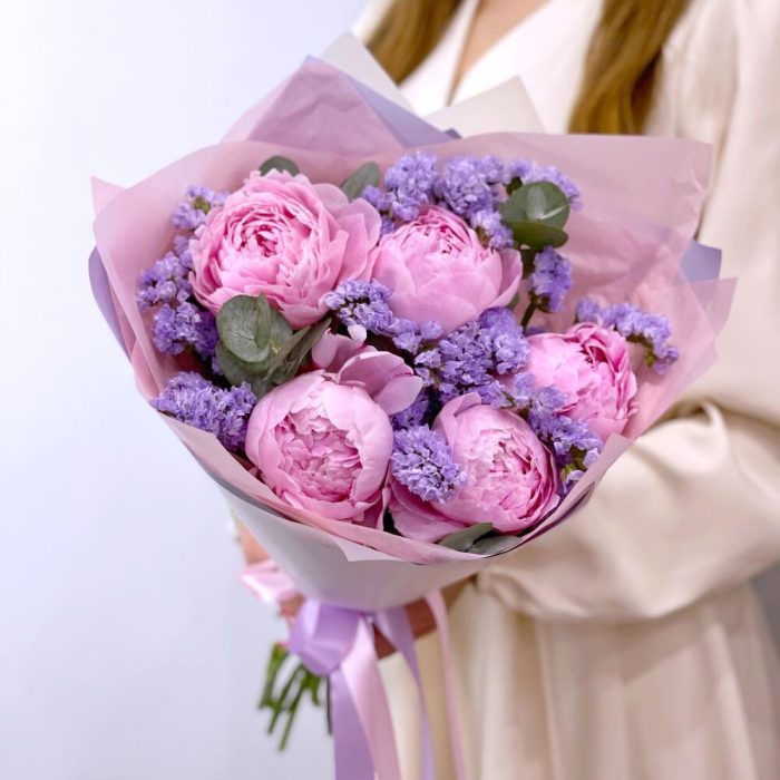 Ароматные розовые пионы Сара Бернар и лавандовая статица в букете, собранном с любовью и нежностью.Обращаем Ваше внимание, что степень раскрытия пионов не зависит от нас. Мы можем гарантировать только свежесть цветов.К каждому букету мы прикладываем:- открытку с Вашими пожеланиями- инструкцию по уходу за букетом- пакетик кризала для продления жизни цветам