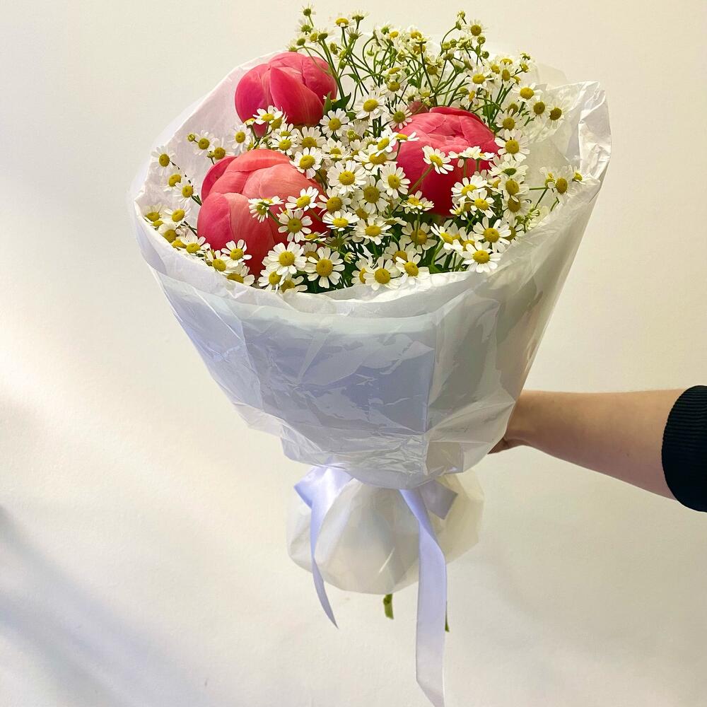 Пион коралл шарм – 3 шт.Матрикария – 5 шт.Упаковка дизайнерская – 1 шт.
