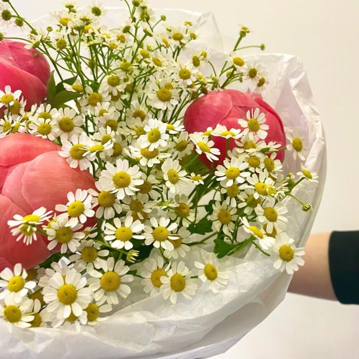 Нежный дуэт пионов и матрикарии