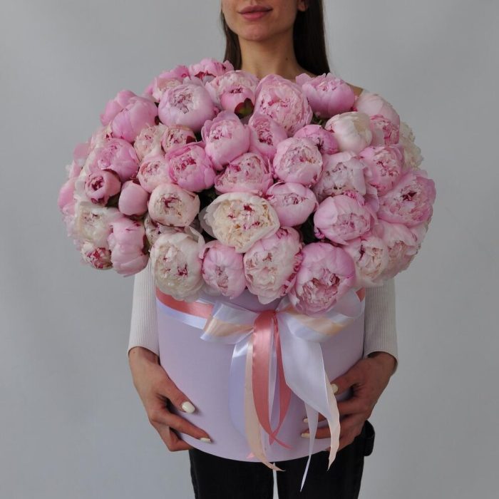 Розовые ароматные пионы Сара Бернар в коробке, 65 штук