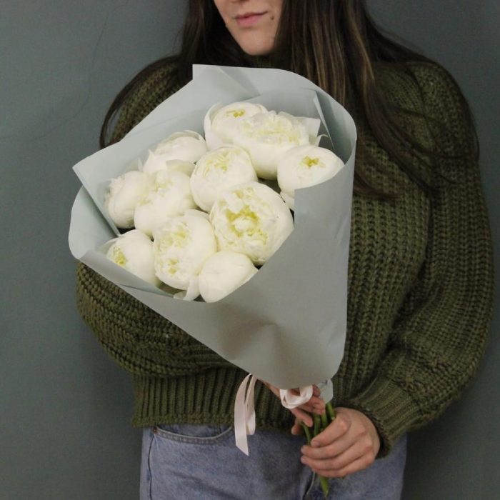 Белоснежный букет из одиннадцати пионов в лаконичной упаковке.
