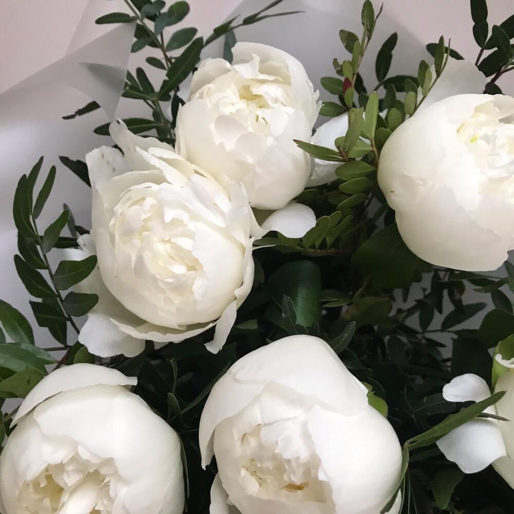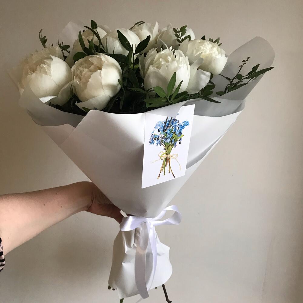 Лента – 2 шт.Зелень – 8 шт.Пион белый – 9 шт.Упаковка дизайнерская – 4 шт.