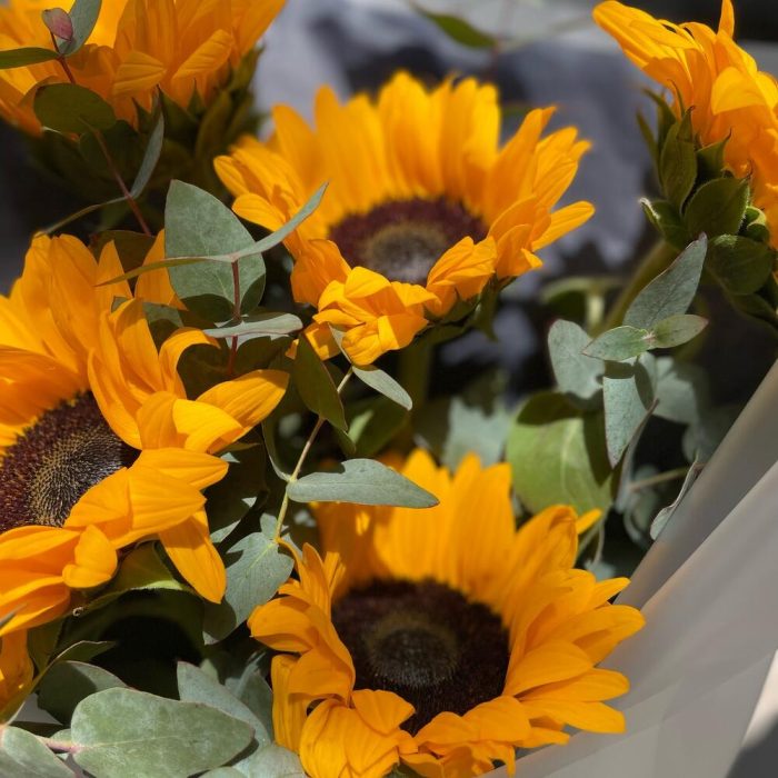 Эвкалипт – 2 шт.Лента атласная – 1 шт.Тишью – 2 шт.Подсолнух – 5 шт.Пленка матовая – 1 шт.
