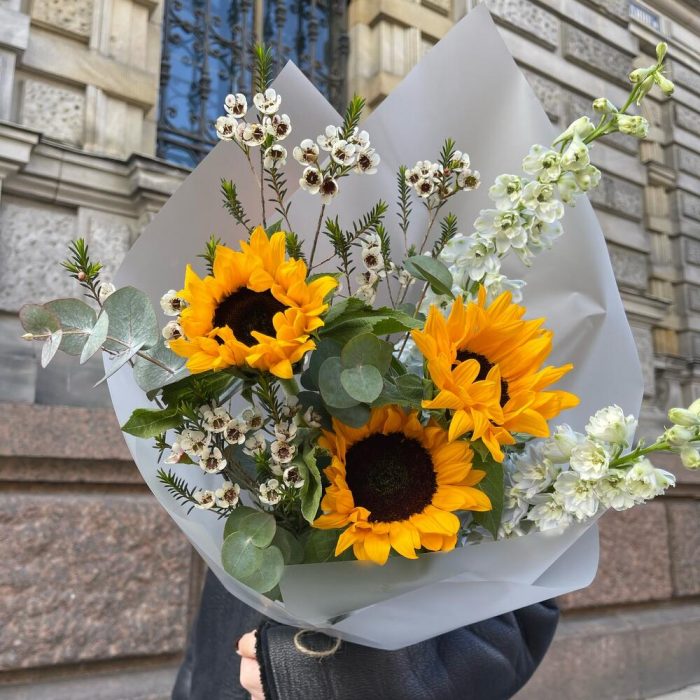 Ваксфлауэр – 2 шт.Дельфиниум – 2 шт.Эвкалипт – 2 шт.Подсолнух – 3 шт.Упаковка дизайнерская – 2 шт.