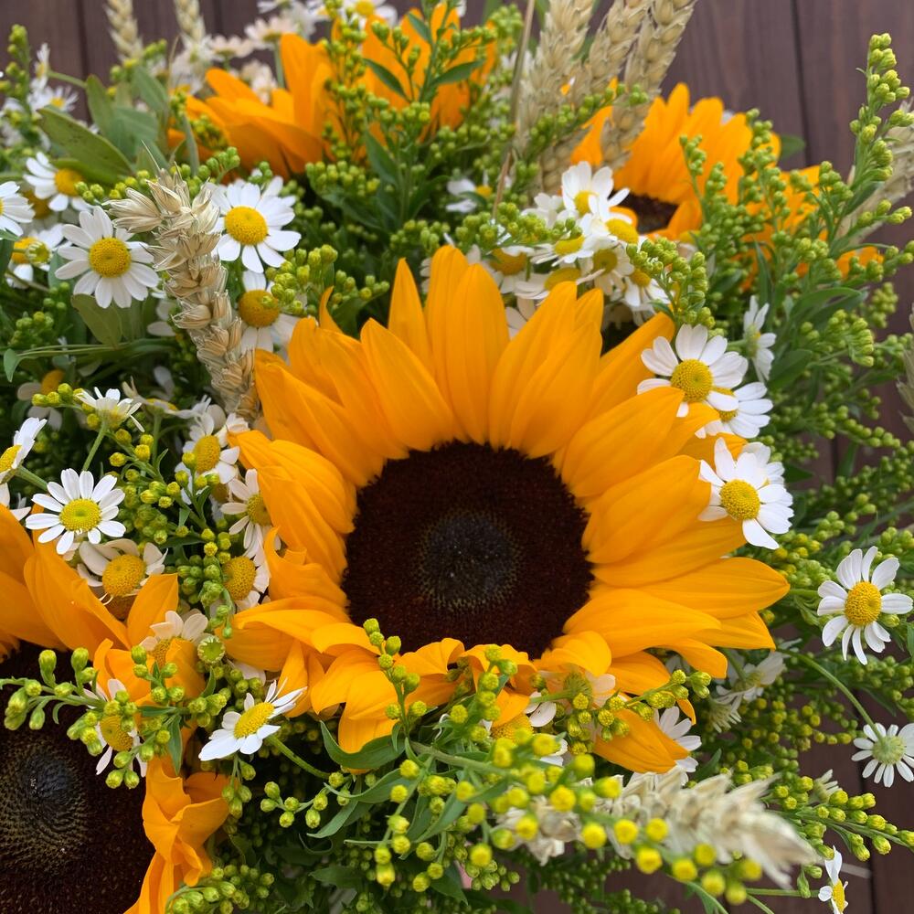Подсолнух – 5 шт.Матрикария (Ромашка Камила) – 7 шт.Солидаго – 5 шт.триникум – 7 шт.Зелень – 3 шт.