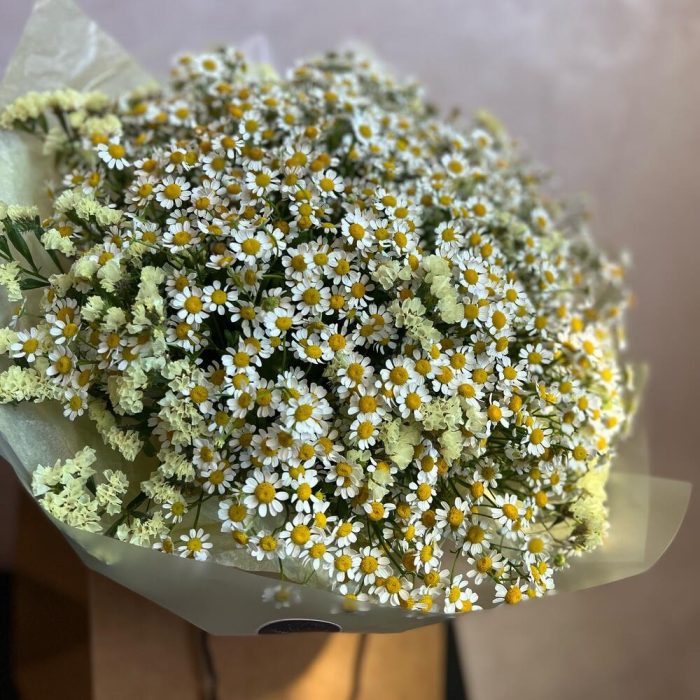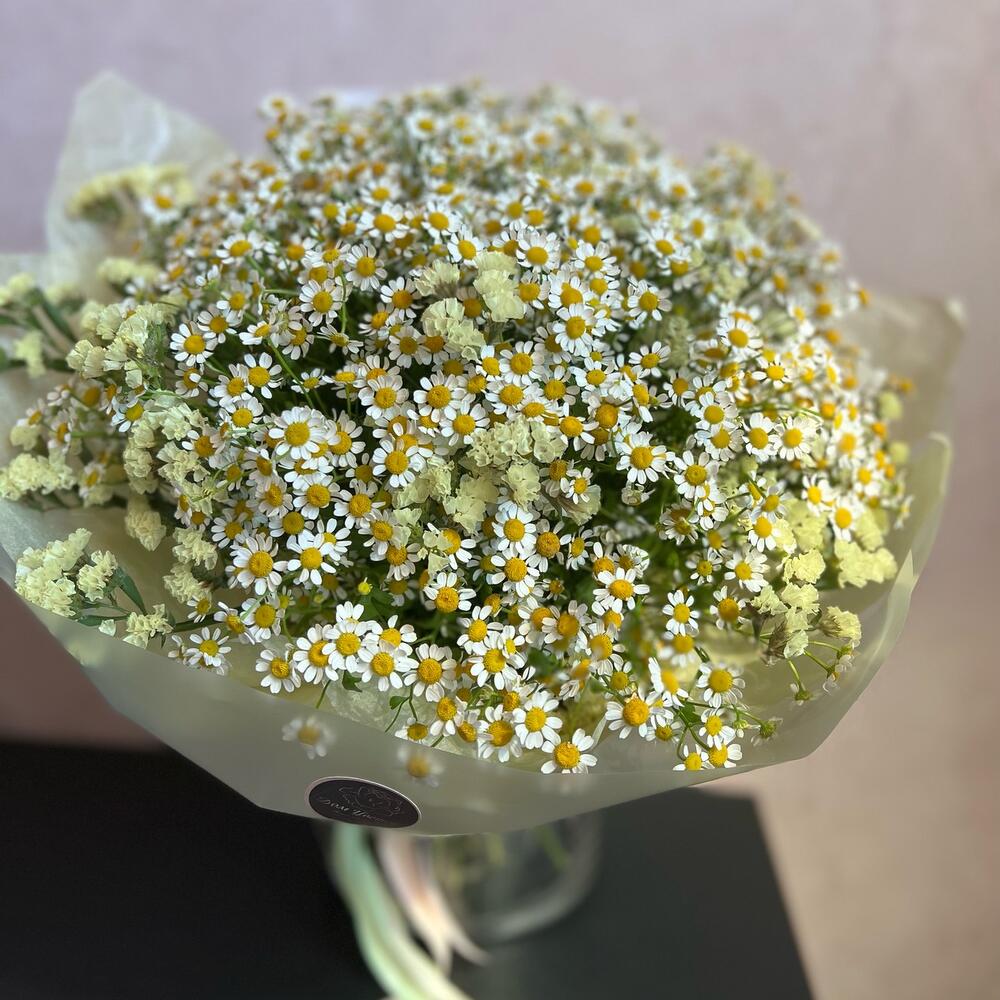 Танацетум – 29 шт.Статица – 4 шт.декоративная упаковка – 1 шт.Атласная лента – 1 шт.