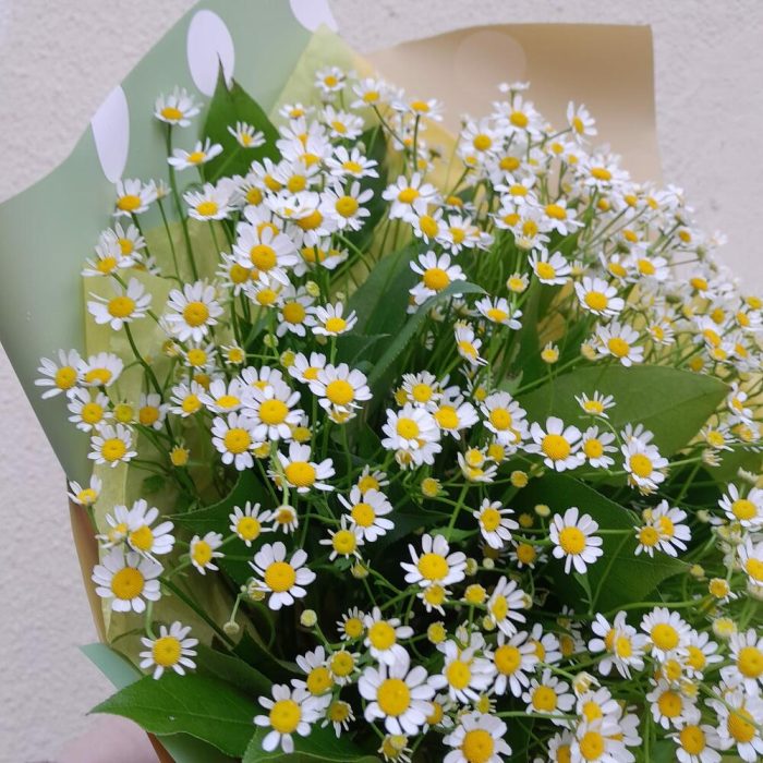 Салал – 5 шт.Лента атласная – 2 шт.Упаковка дизайнерская – 3 шт.матрикария (полевая ромашка) – 15 шт.