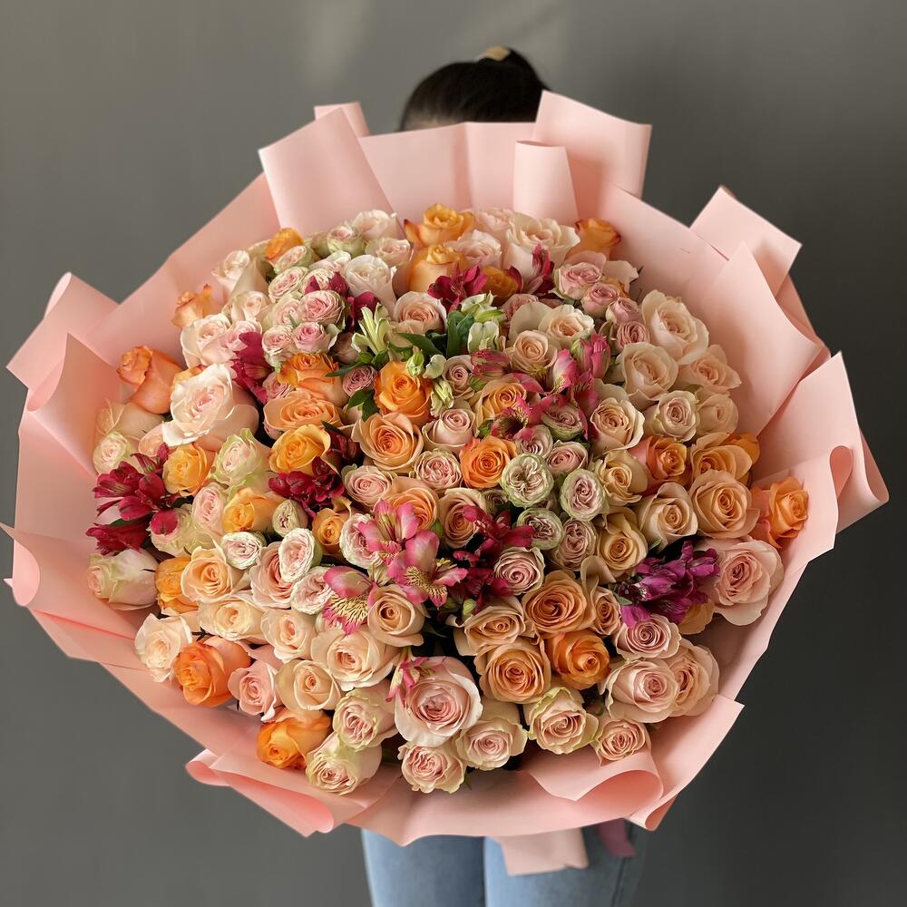 Альстромерии, Гортензии, Кустовые розы, Лизиантусы, Розы, Хризантемы