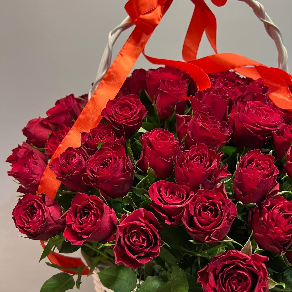 Метки: 101 роза, от 5000 руб, цветы в корзине