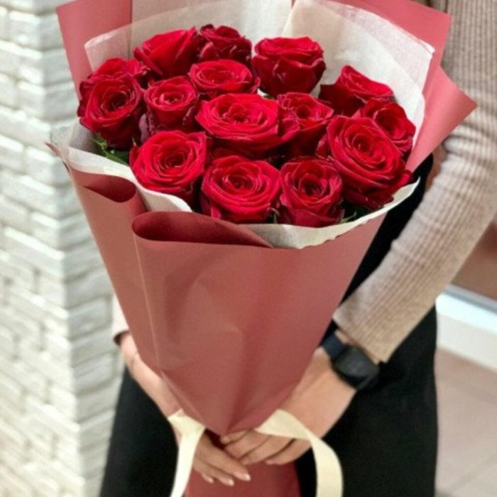 Атласная лента – 1 шт. Красная роза – 15 шт. Современная упаковка – 1 шт.