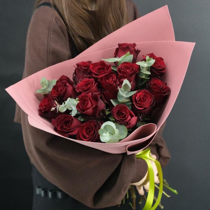 Лента – 2 шт.Эвкалипт – 1 шт.Упаковка – 1 шт.Роза Эксплорер – 15 шт.Фоамиран – 2 шт.подкормка для срезанных цветов – 1 шт.