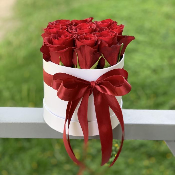 Роза – 9 шт.Коробка – 1 шт.бант атласный – 1 шт.