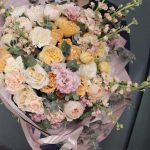 Маттиола – 7 шт.Лизиантус – 7 шт.Роза кустовая пионовидная – 3 шт.Роза пионовидная – 9 шт.Диантус – 9 шт.Эвкалипт – 9 шт.Фисташка – 5 шт.Тишью – 3 шт.Бумага – 3 шт.Лента атласная – 3 шт.