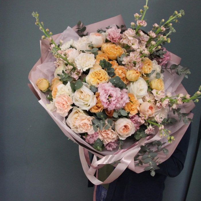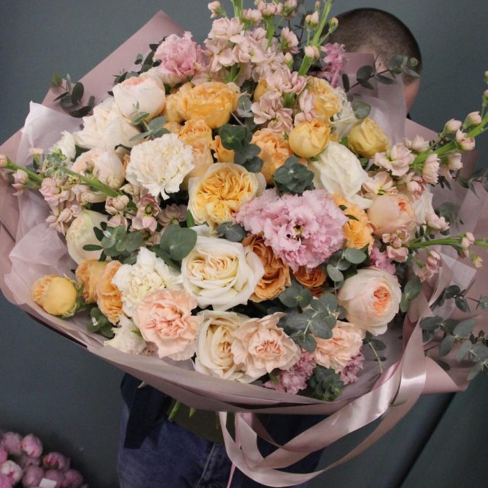Маттиола – 7 шт.Лизиантус – 7 шт.Роза кустовая пионовидная – 3 шт.Роза пионовидная – 9 шт.Диантус – 9 шт.Эвкалипт – 9 шт.Фисташка – 5 шт.Тишью – 3 шт.Бумага – 3 шт.Лента атласная – 3 шт.