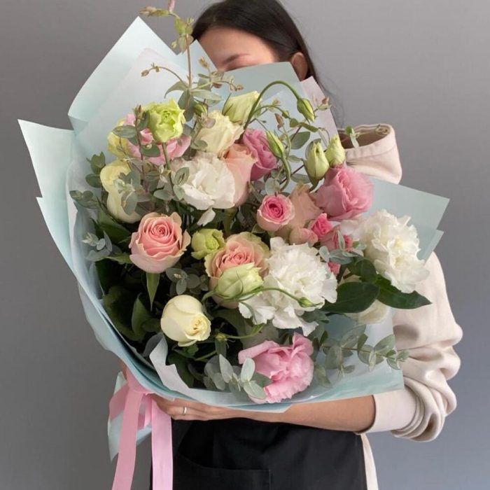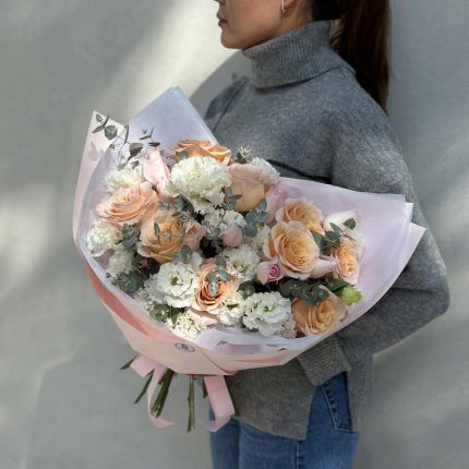 Букет с розами и лизиантусами