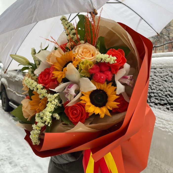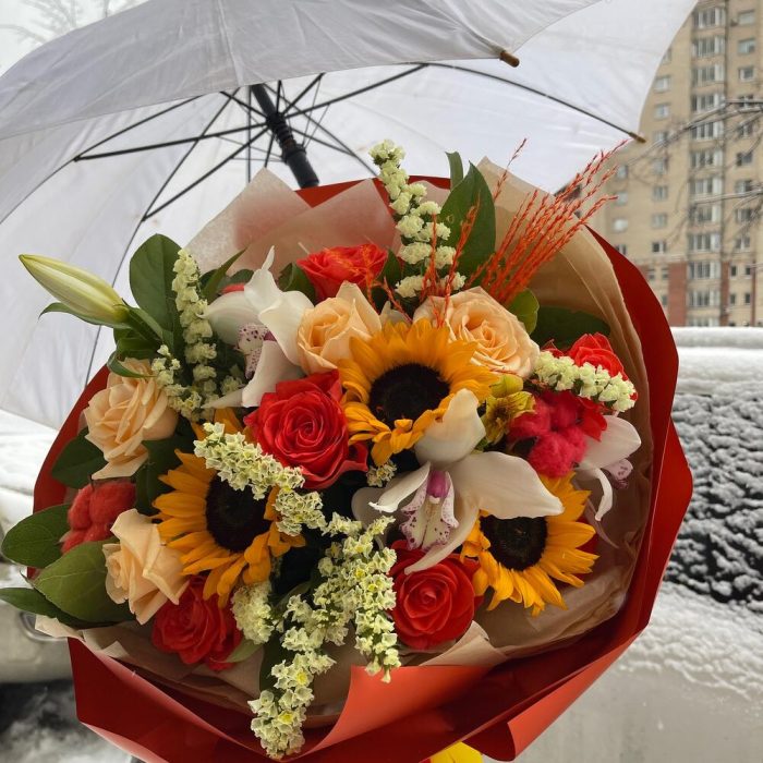 Альстромерия – 1 шт.Орхидея Цимбидиум – 3 шт.Статица – 3 шт.Роза Россия – 9 шт.Подсолнух – 3 шт.Пленка матовая – 6 шт.Салал пучок – 1 шт.сухоцвета – 10 шт.