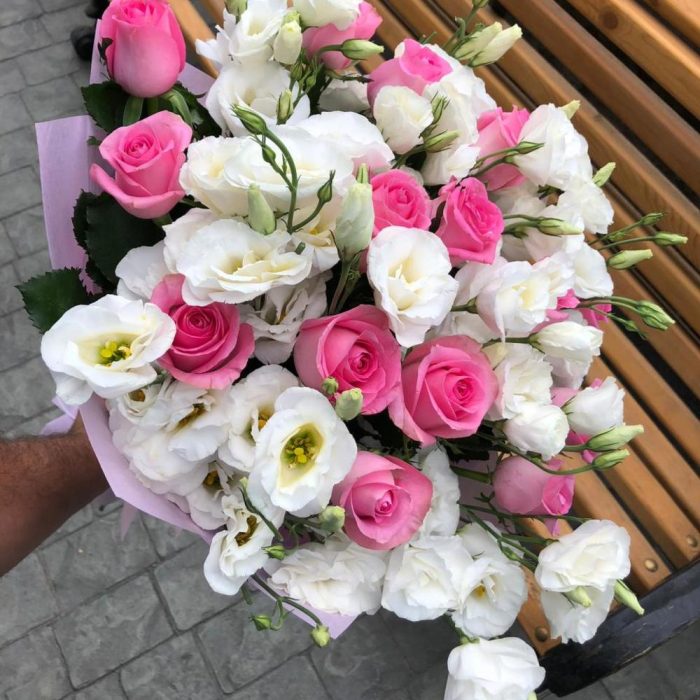 Роза розовая – 15 шт. эустома белая – 10 шт. Упаковка пленка матовая – 1 шт.