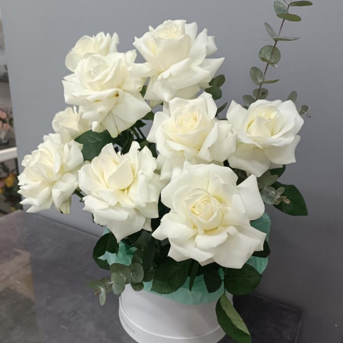 французские розы – 5 шт. Эвкалипт – 2 шт. открытка с вашими пожеланиями – 1 шт.