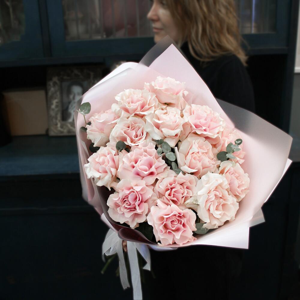 Эвкалипт – 2 шт.Атласная лента – 2 шт.Французская роза – 15 шт.Матовая пленка – 3 шт.