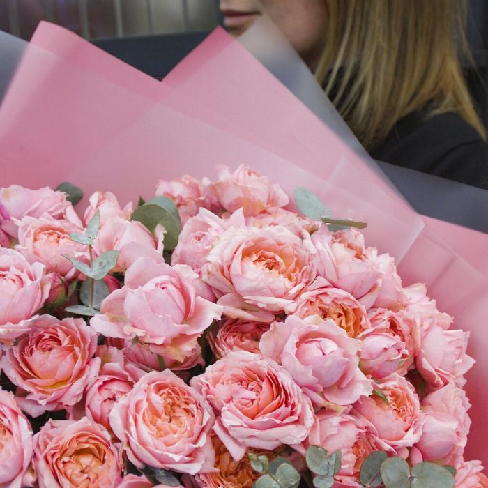 Эвкалипт – 3 шт.Атласная лента – 2 шт.Матовая пленка – 4 шт.Роза кустовая джульетта – 15 шт.