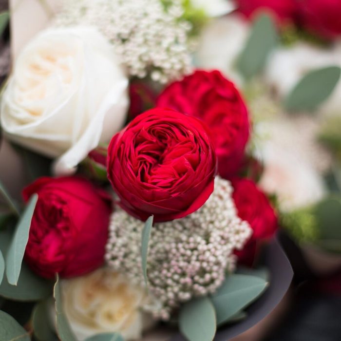 Озотамнус – 4 шт.Эвкалипт Микс – 8 шт.пионовидные розы red piano – 9 шт.пионовидные молочного оттенка – 9 шт.