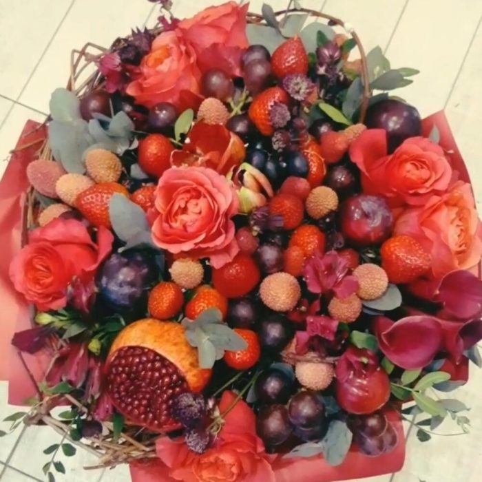Клубника – 15 шт.Роза красная – 7 шт.Лента атласная – 1 шт.Гранат – 1 шт.Слива – 5 шт.Виноградная лоза – 9 шт.Виноград гроздь – 5 шт.зелень декоративная – 10 шт.виноград черный – 2 шт.экзотика – 7 шт.микс цветов – 11 шт.упаковка дизайнерская1 – 1 шт.