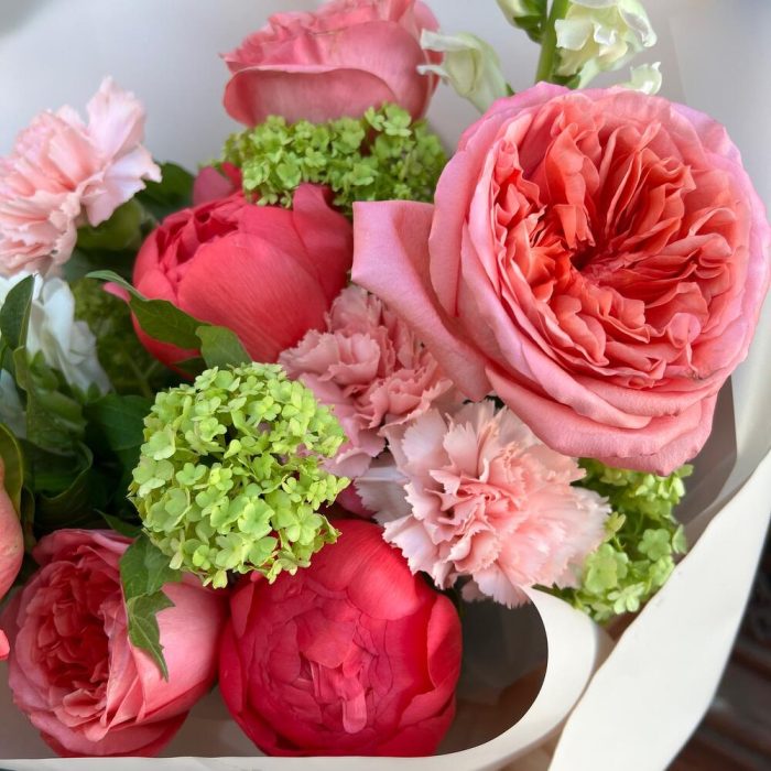 Вибурнум – 1 шт.Лента атласная – 2 шт.Диантус – 3 шт.Пленка матовая – 5 шт.Пион коралл шарм – 3 шт.антиринум – 2 шт.роза пионовидная пинк экспрешн – 3 шт.