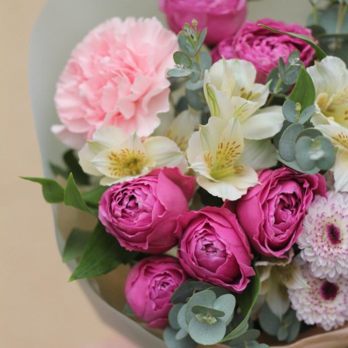 Категорий: Альстромерии, Гвоздики, Пионовидные розы, Розы, Хризантемы
