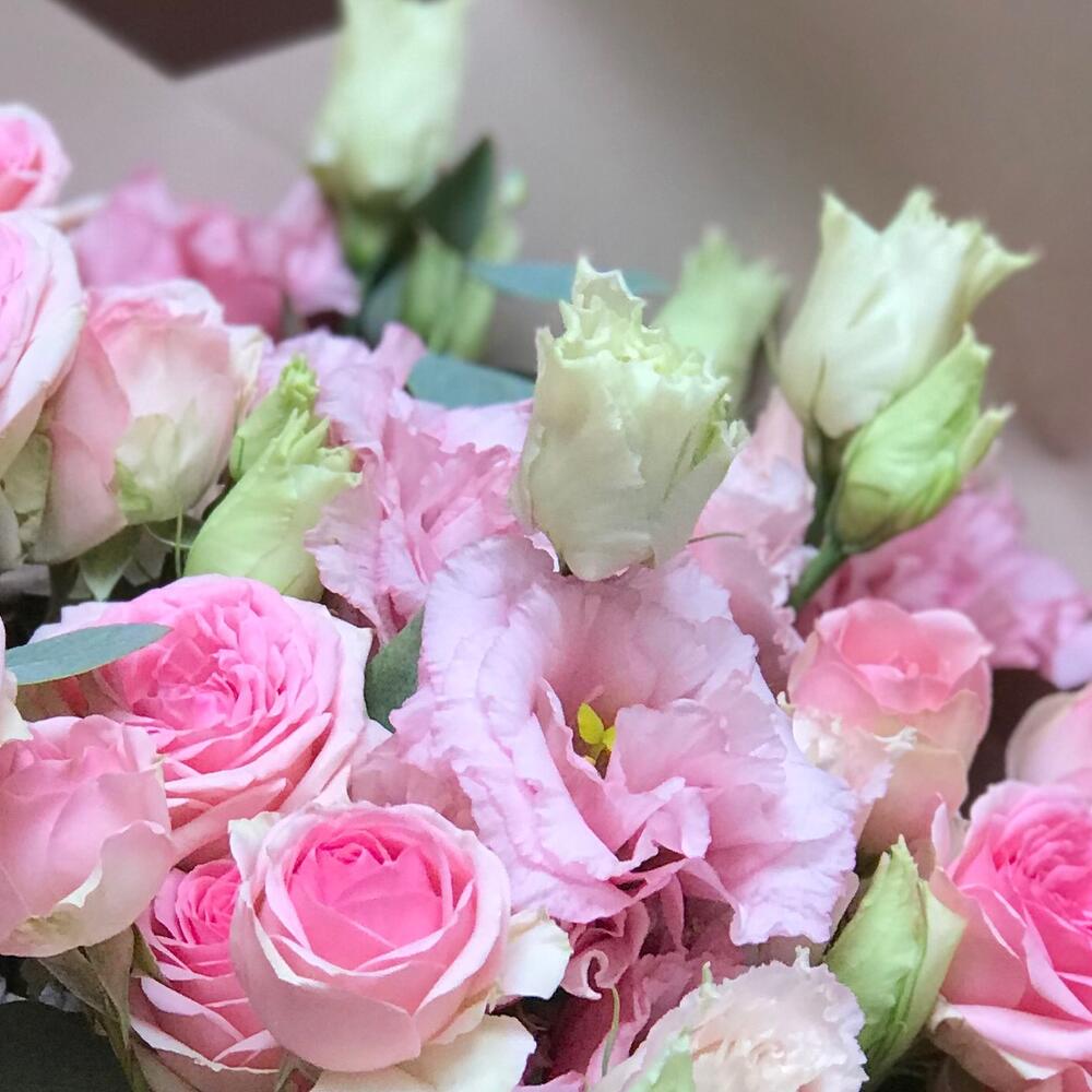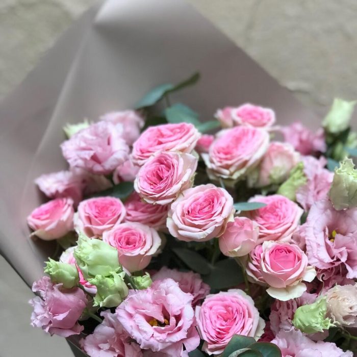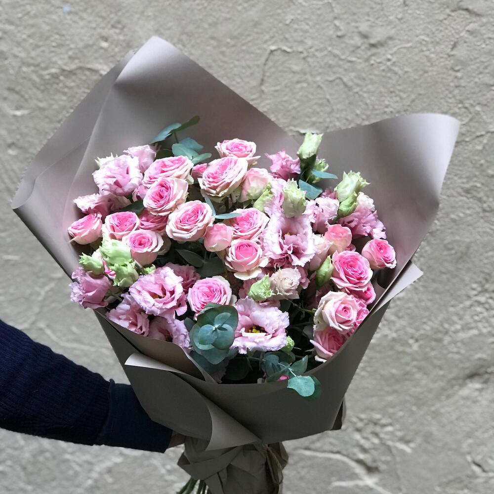 Лизиантус – 7 шт.роза кустовая динара – 5 шт.эвкалипт цинерея пучок – 1 шт.Упаковка дизайнерская – 1 шт.
