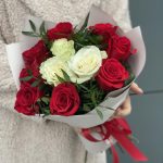 Роза белая – 3 шт. Роза красная – 8 шт. Оформление – 1 шт. Писташ – 5 шт.