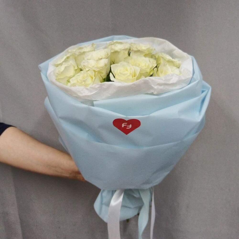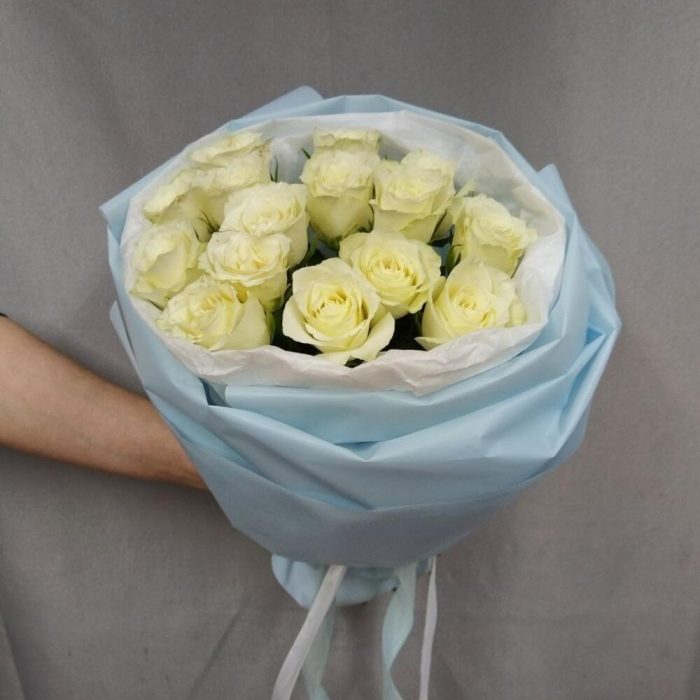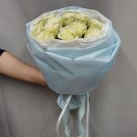 роза кения белая 40 см – 15 шт.Корейская пленка – 1 шт.Тишью белое – 1 шт.Атласная лента – 1 шт.